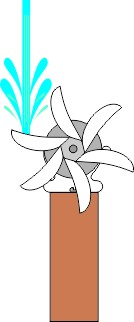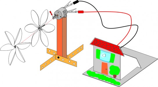 Fixer à l'axe de l'alternateur une hélice pour produire de l'électricité avec le vent (en soufflant fort dessus ou en gonflant le ballon et en orientant le tube) ou une turbine hydraulique (à faire tourner sous l'eau du robinet). Pour changer de 'roue', dévisser/visser la vis extérieure de la pièce de jonction.