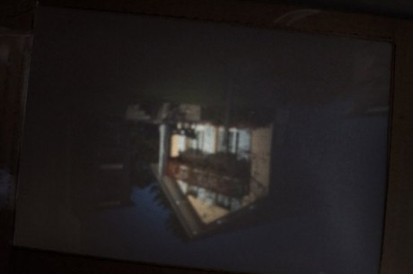 En regardant par les œilletons, l’image est projetée à l’envers sur le papier calque qui retient une partie de la lumière.