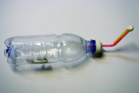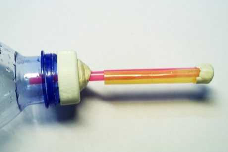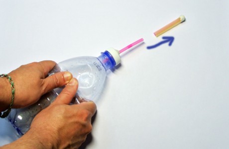 On peut aussi poser la bouteille au sol et orienter la fusée verticalement grâce au soufflet de pliage de la paille. Ensuite, écraser vigoureusement la bouteille avec le pied pour un décollage original.