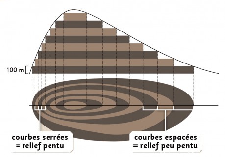 Der Raum zwischen zwei Kurven auf einer Karte hat immer den gleichen Höhenunterschied. Dies kann je nach Karte variieren (100 m für die hier verwendete Karte).