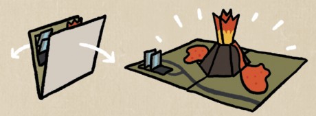 La carte peut maintenant délicatement être repliée puis ouverte d’un coup pour faire apparaître, comme par magie, le volcan en 3D et ses jets de lave.
