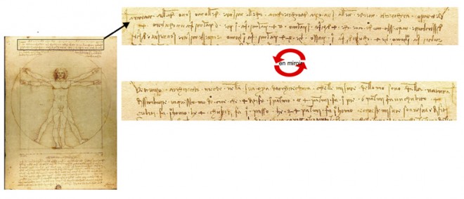 Exemple d'écriture spéculaire sur le manuscrit 'Homme de Vitruve' par Léonard da Vinci
