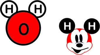 La molécule d’eau est composée “comme un mickey”: 2 petits atomes d’hydrogène (H) et 1 gros atome d’oxygène (O).