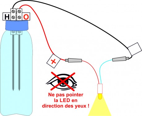 Après une électrolyse d’environ 15 minutes, débrancher la cellule et connecter à la place la LED en respectant les polarités. La LED devrait s’allumer pendant au moins 15 à 30 secondes.