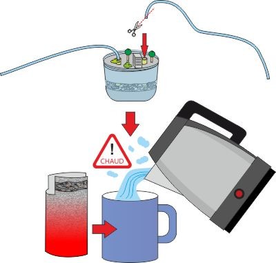 To simulate the heat of the centre of the earth, boil water and pour it into the cup almost to the top. Place the jar on top of the cup.