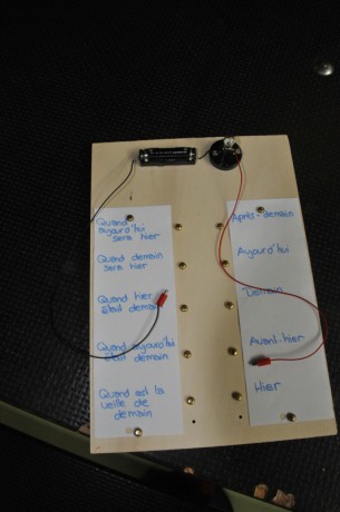 Quand on touche le bon couple question-réponse avec les deux fiches électriques, on forme un circuit électrique fermé et l'ampoule s'allume.