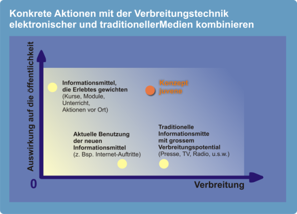 juvene nutzt durch ihr innovatives Konzept die gesamten Möglichkeiten der neuen Informationstechnologien und kombiniert sie mit den Vorteilen der traditionellen Werkzeuge zur Vermittlung von Information und Wissen, insbesondere der konkreten Aktion vor Ort.